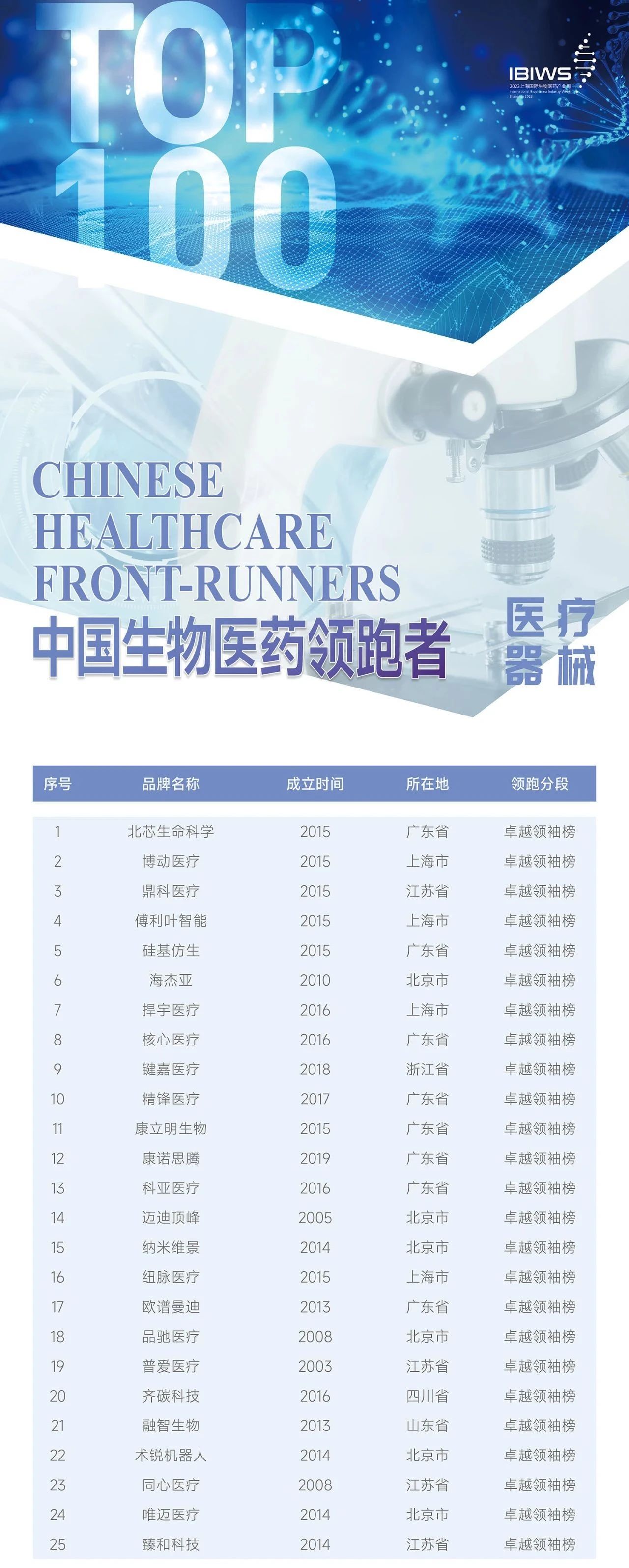 近日,上海市生物医药产业促进中心、普华永道、上海科创集团、医耘科技、第一财经联合开展“2023中国生物医药领跑者(Front-Runners)100榜单”评选活动落下帷幕。本次论坛的TOP100评选活动,旨在向公众传达当下生物医药产业最新现状与发展趋势,从而窥见几分时代的脉搏,「海杰亚医疗」凭借赛道优势与优秀成长潜力,荣登医疗器械榜单第6位!